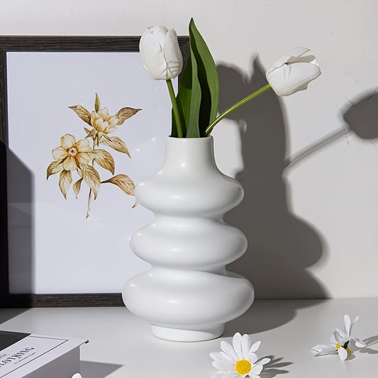 Bohemian Woven-Style Plastic Vase Suitable for Home Decor - Minimalist Striped White Round Cylindrical Vase with Woven Texture, Modern Centerpiece for Wedding Table, Housewarming Gift, Office Desk Arrangement, Plastic Flower