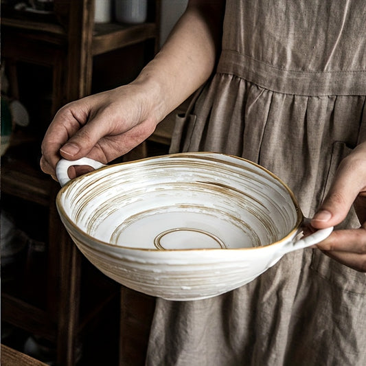 Handmade Rustic Pottery Bowl with Handles – Retro Deep Plate & Serving Bowl