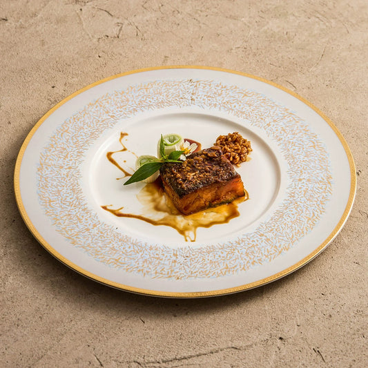Handcrafted Gold-Brushed Matte Ceramic Plate with Raised Rim
