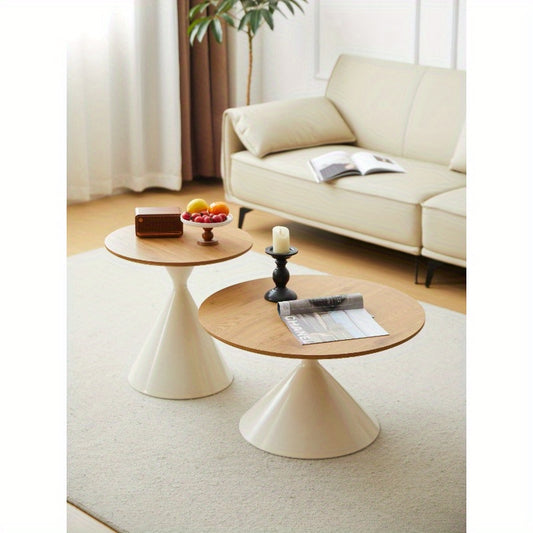Nesting Coffee Table Set of 2 – White Beige Wood-Grain Round Tables