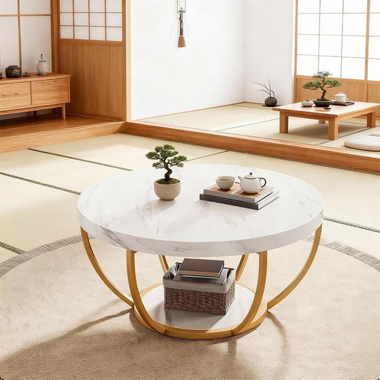 Round Coffee Table with Storage Shelf – Gold Metal Frame & Double-Layer Design