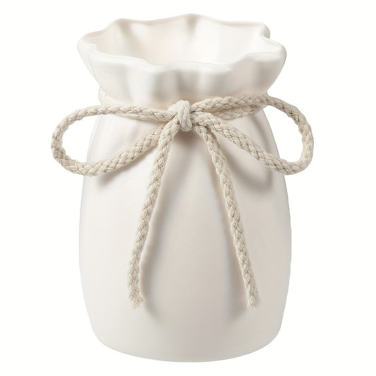 1pc, Creative Plastic Vase for Decorative Dried Flowers, Pink Tabletop Modern Floral Arrangement Ornament, Modern Minimalist White Plastic Vase with Burlap Bow - Cylindrical Design Suitable for Fresh Flowers, Water Storage