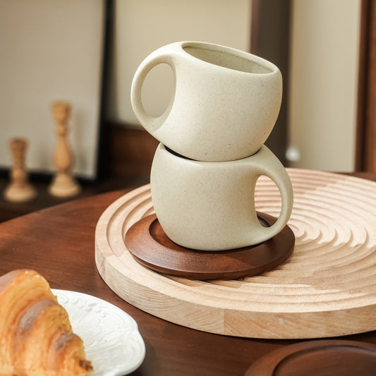 1pc Handmade Heavy-Duty Ceramic Coffee Mug with Large Spout & Funnel Design, Real Wood Handle & Coaster - 8.45oz Thick Cup for home, Office, Cafe Use - Ideal Gift for Coffee & Tea Lovers, Durable Ceramic Ware (Hand Wash Only)