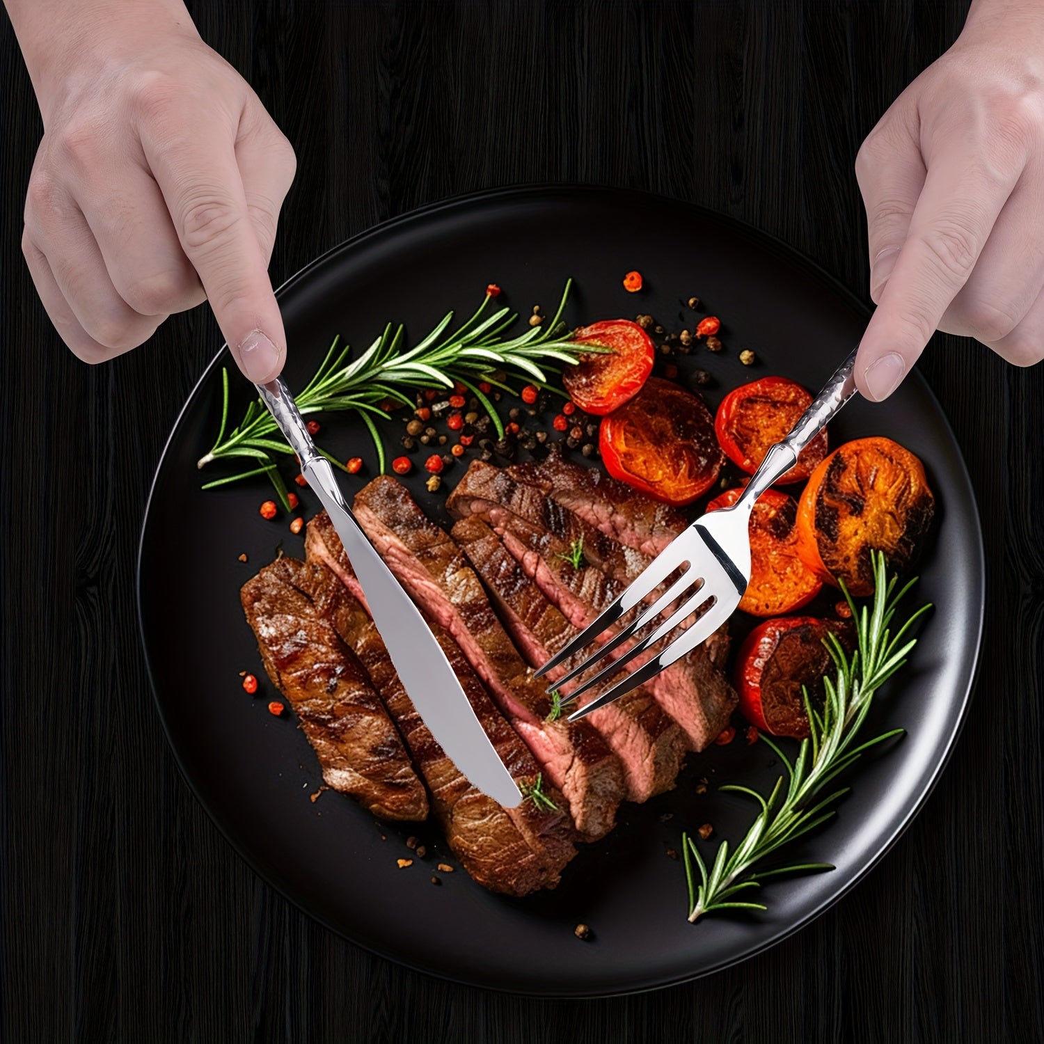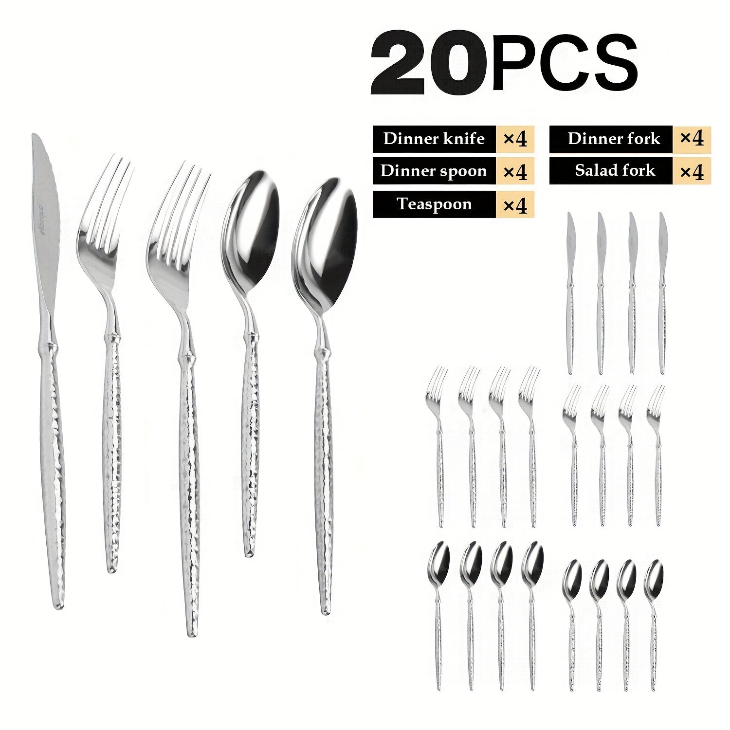 20pcs Silvery Stainless Steel Flatware Set with Hammered Handles, 4/6-Person Service, Includes Knives, Forks And Spoons, Mirror Polished, Dishwasher Safe, Ideal for Family Gatherings
