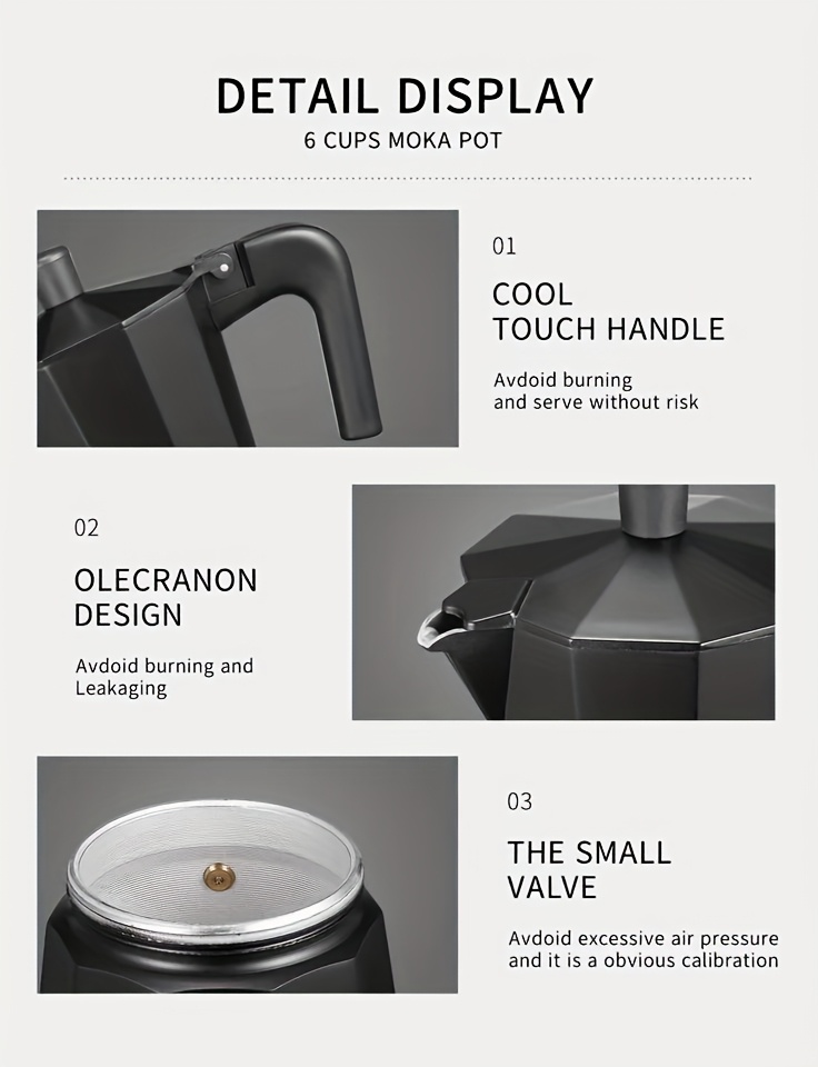 · This Moka pot brews up to 6 cups of espresso, suitable for serving multiple people.