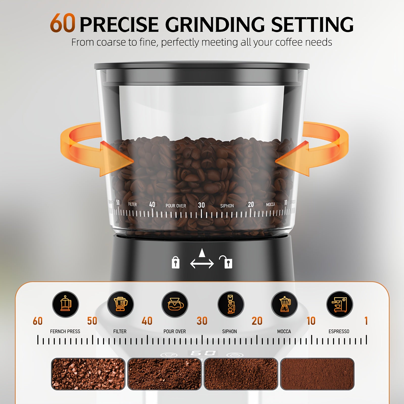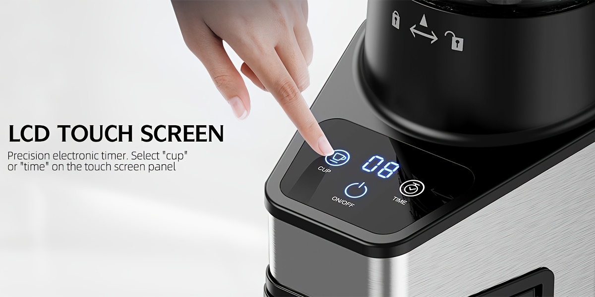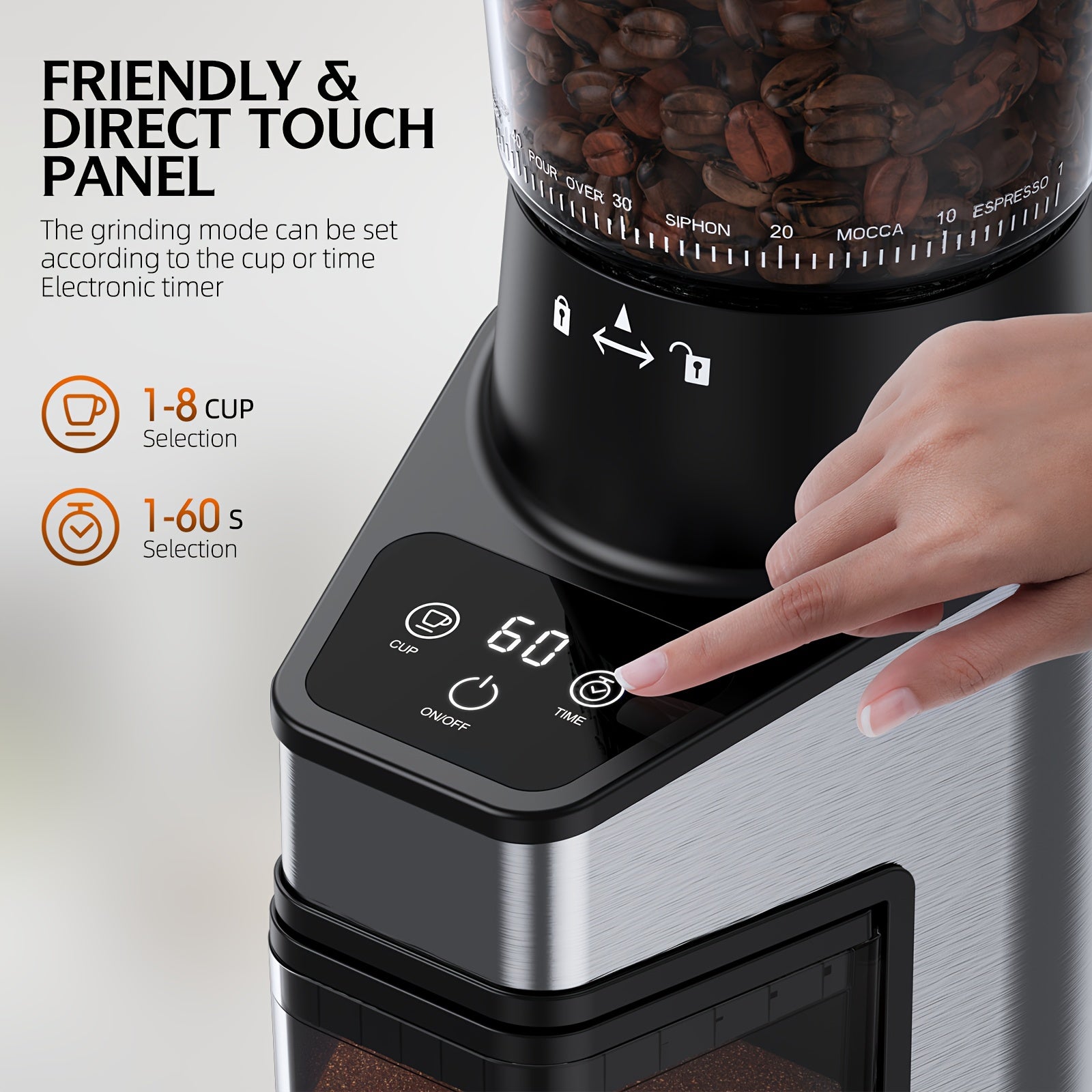 Burr Coffee Grinder with 60 Grinding Settings | Electric Coffee Bean Grinder for Home Use with 60 Seconds Timer, 1-8 Cup Capacity, Touch Screen, Anti-static, 430 Stainless Steel, Black