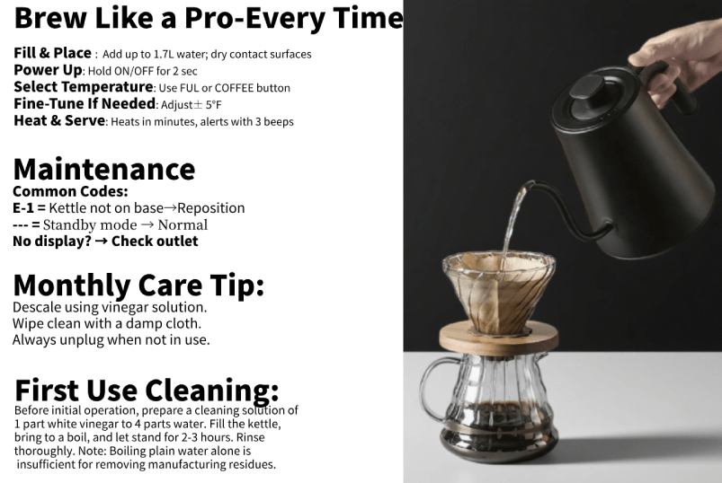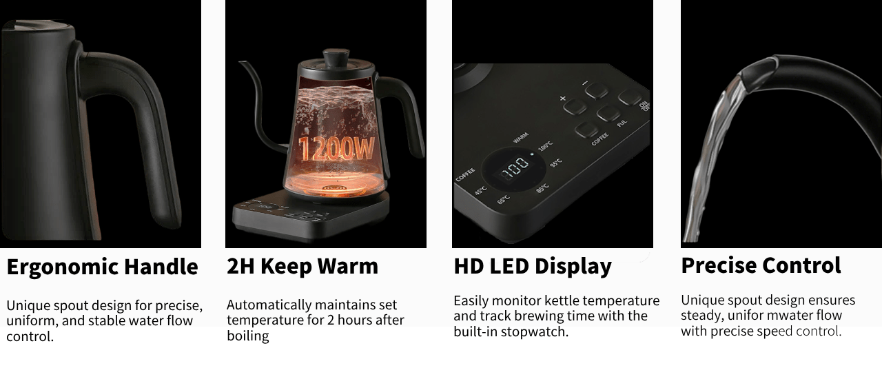 Versatile Usage: 35.2oz/0.91qt/1L Capacity, Black hand-brew coffee kettle, Stainless Steel Interior 1200W Electric Kettle appearance looks great in kitchen.Boils water quickly,great for when I'm in a rush in the morning.Used this electric kettle allows you to boiling water for various purposes like frothed milk, honey water,lemonade,scented tea,with its precise temperature control for making Various hot drinks/beverages,and it works like a charm every time.Experience the art of brewing with perfect for coffee lovers and tea enthusiasts.