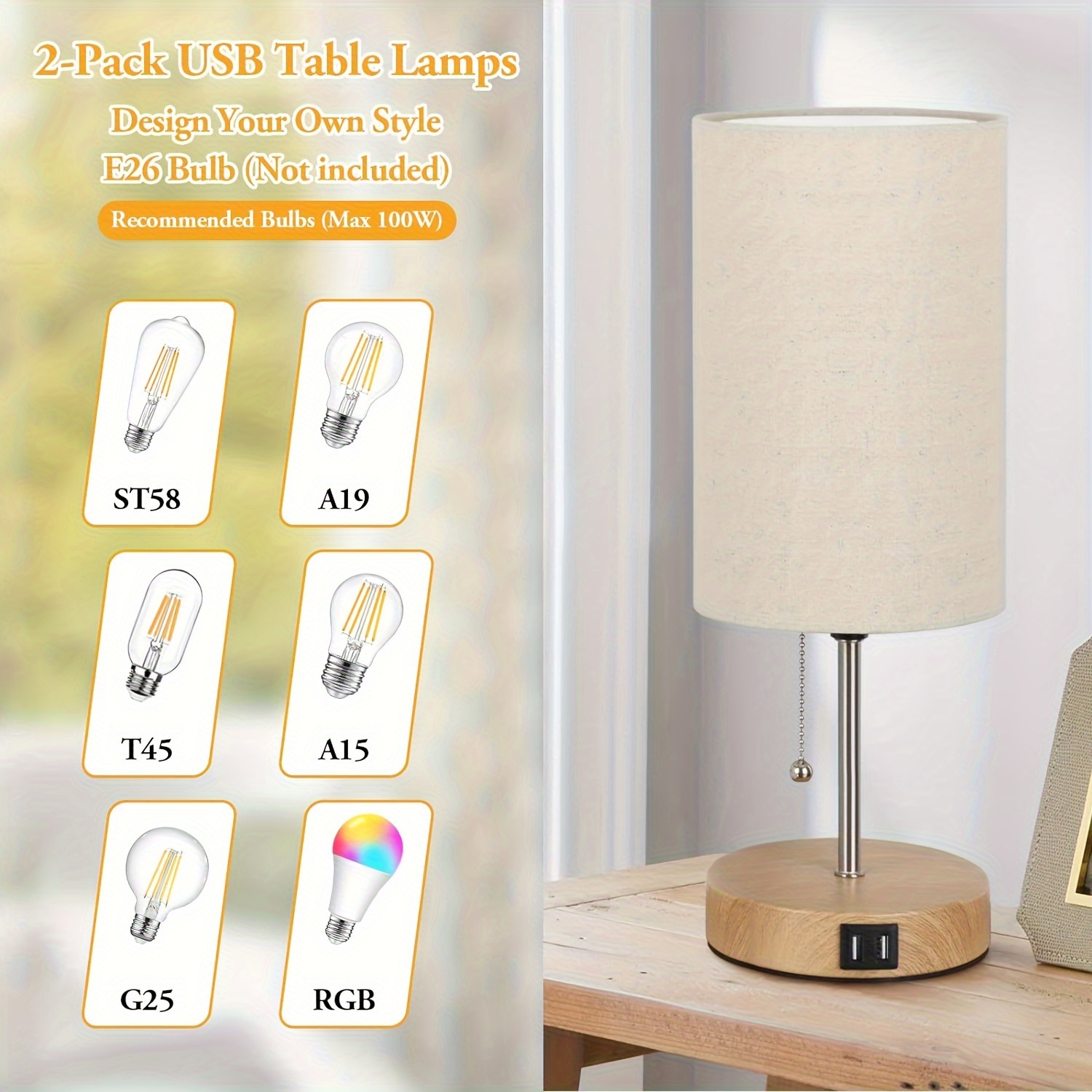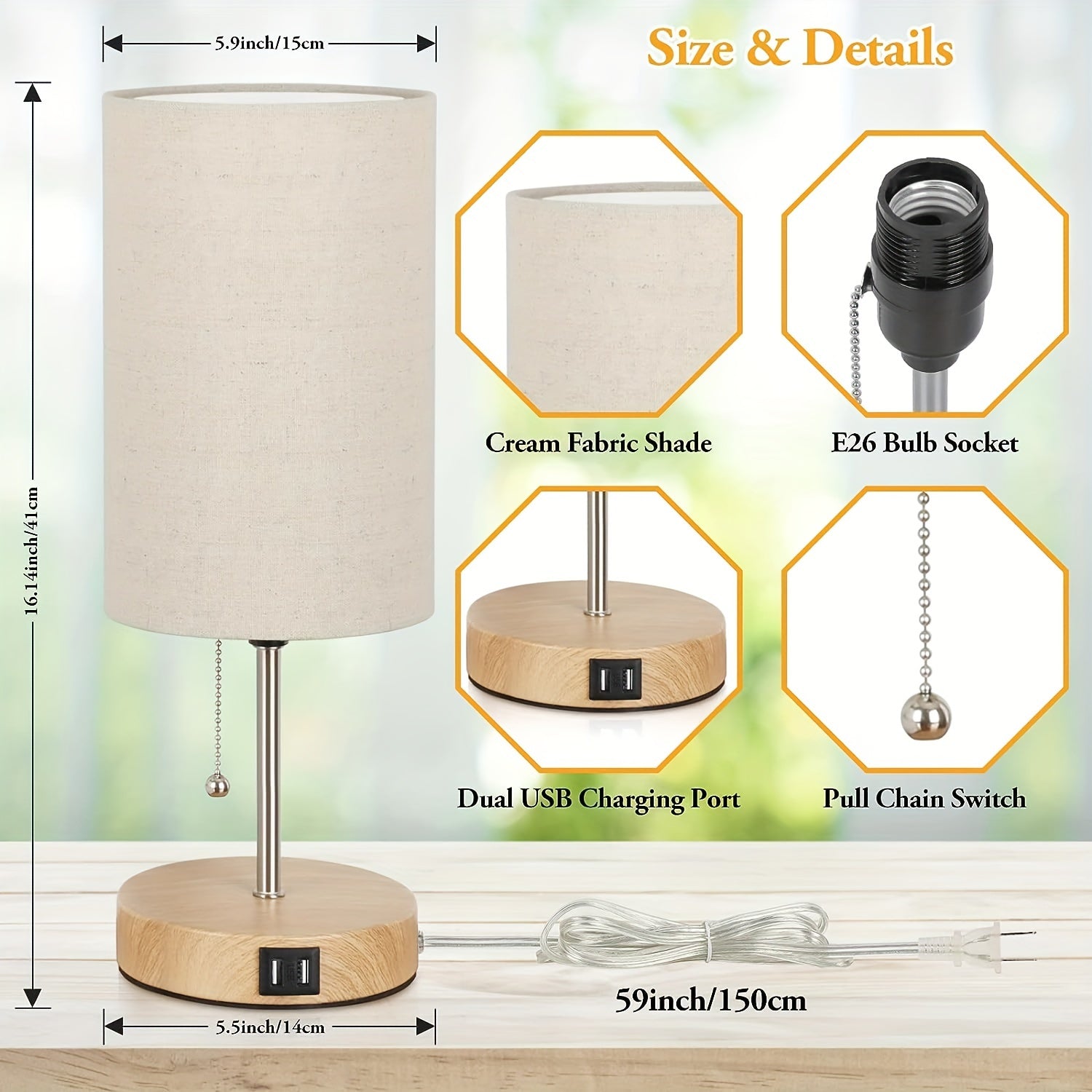 Set of 2 Table Lamps with 2 USB Ports, Modern Bedside, Desk Lamps with Pull Chain, Nightstand Lamps with Cream Fabric Shade and Metal Base for Living Room Bedroom Office Reading Dorm Hotel