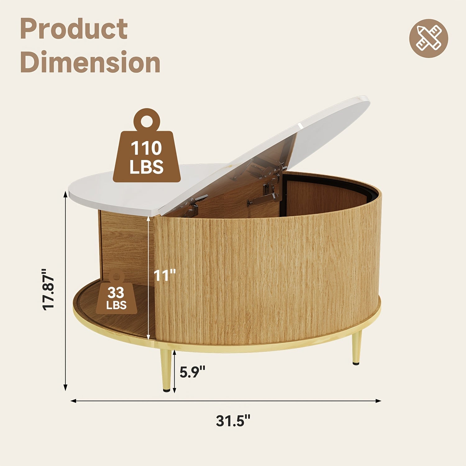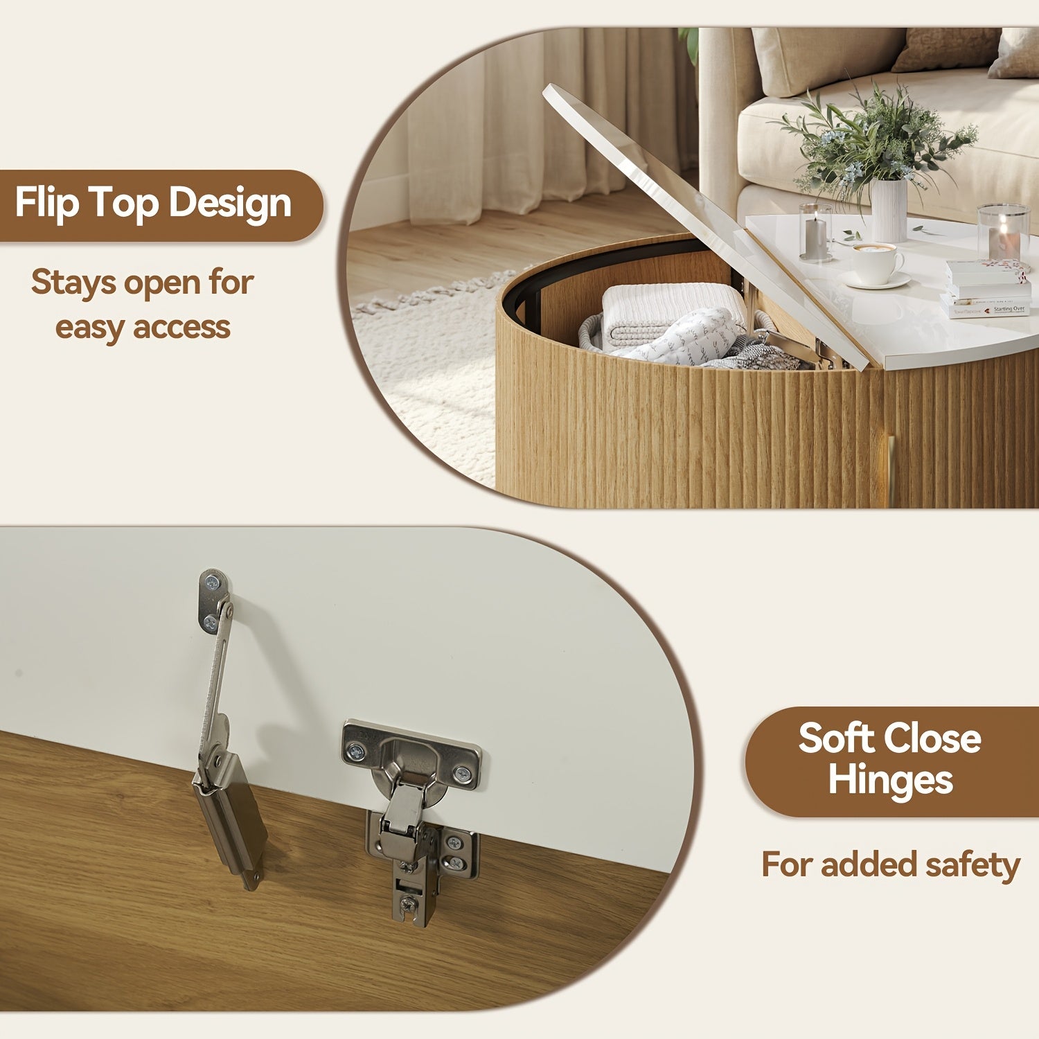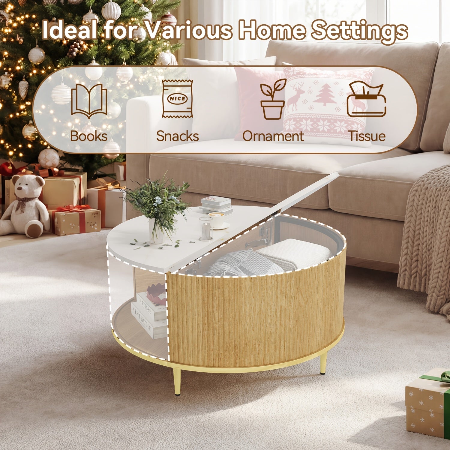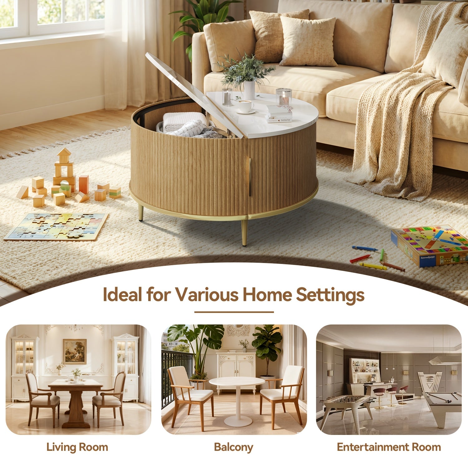 Modern Fluted Drum Coffee Table (31") with Hidden Storage & Sliding Doors – Oak Finish