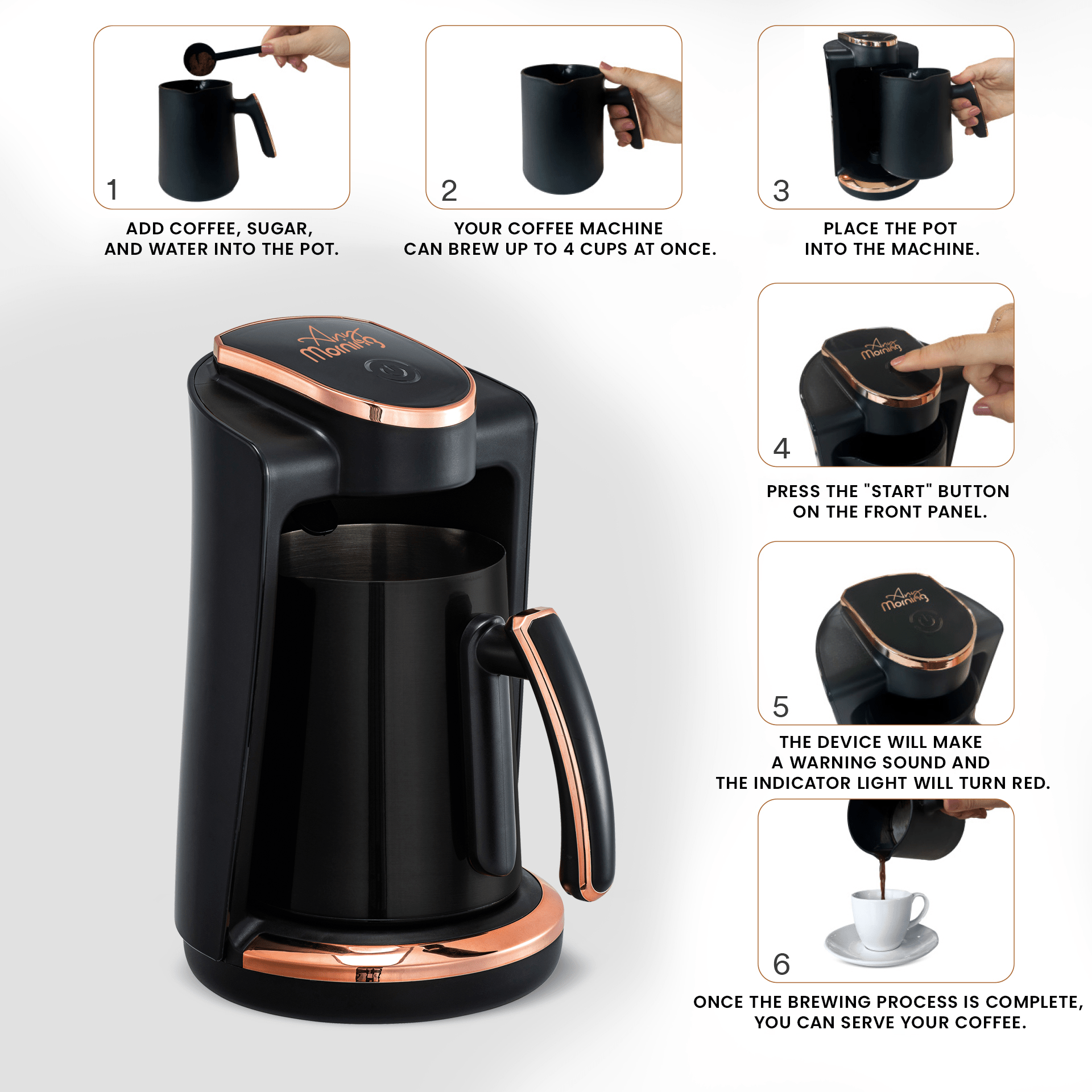 · Authentic Turkish Coffee Experience: With its slow brewing feature, you can prepare 4 cups of rich, aromatic coffee with a 250 ml capacity.