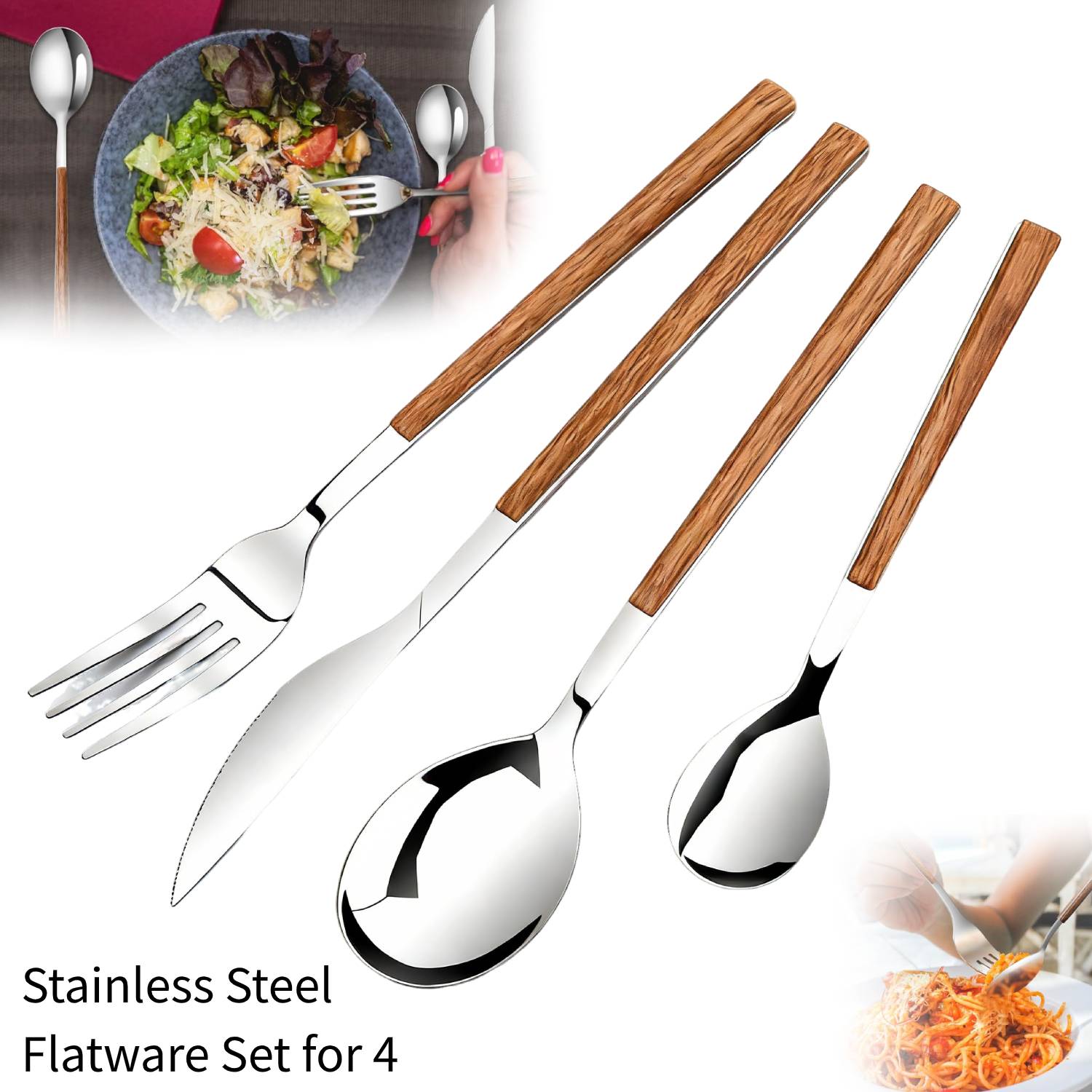 Forks and Spoons Set, Wooden Handle Flatware Set 16pcs (4 Sets) Stainless Steel Cutlery Set Wooden Spoons Dinner Knife Dinner Fork and Spoon Set (Silvery)