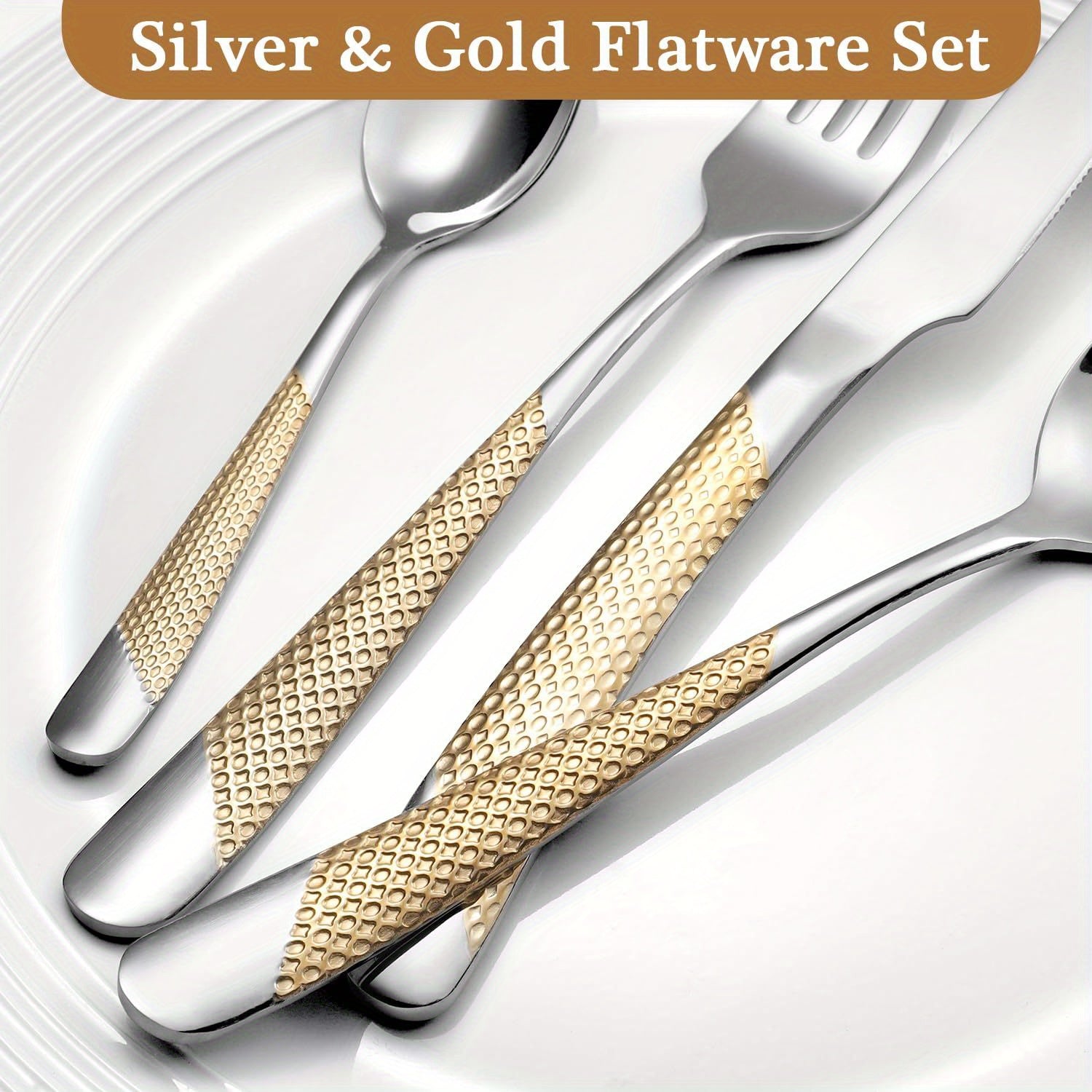 Hammered Modern Golden/Silvery Silverware Set, 40pcs Cutlery Set for 8, Stainless Steel Flatware Set for Home, Kitchen, Restaurant and Hotel, Mirror Polished Silverware Set, Dishwasher Safe