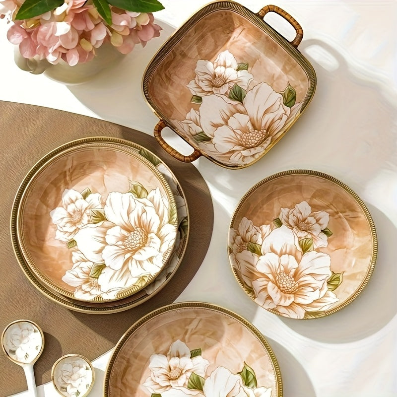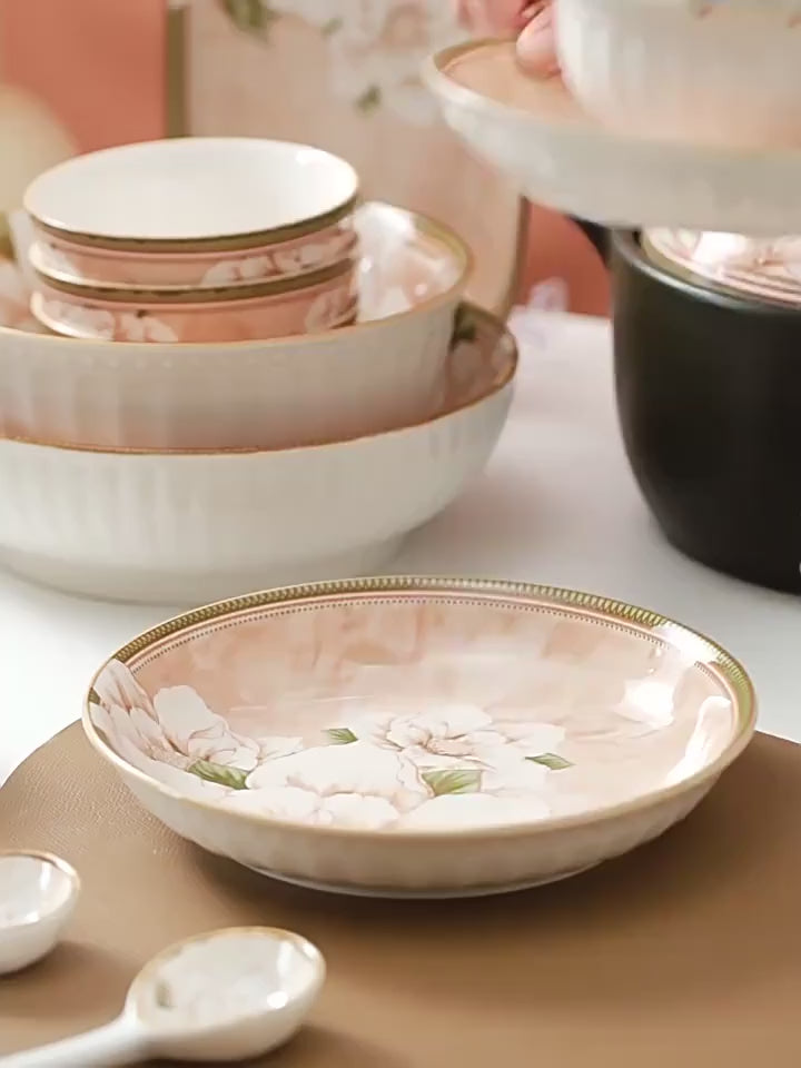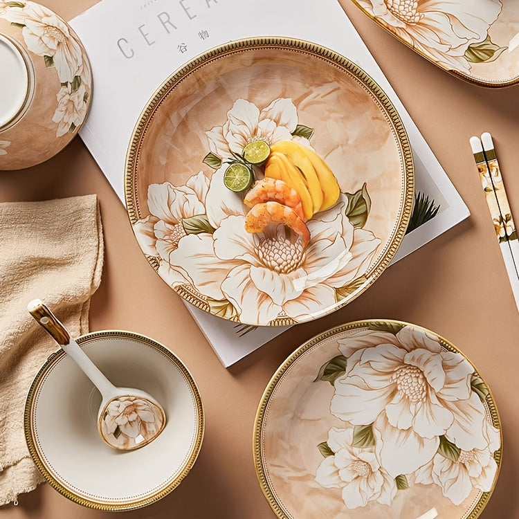 Bring refined elegance to your table with this camellia-pattern ceramic dinnerware set, designed with a high-end “light luxury” aesthetic that feels timeless, delicate, and beautifully curated. Perfect for everyday dining and elevated hosting, it’s ideal for serving salads, steaks, pasta, cake, and more—whether at home or in professional dining environments.