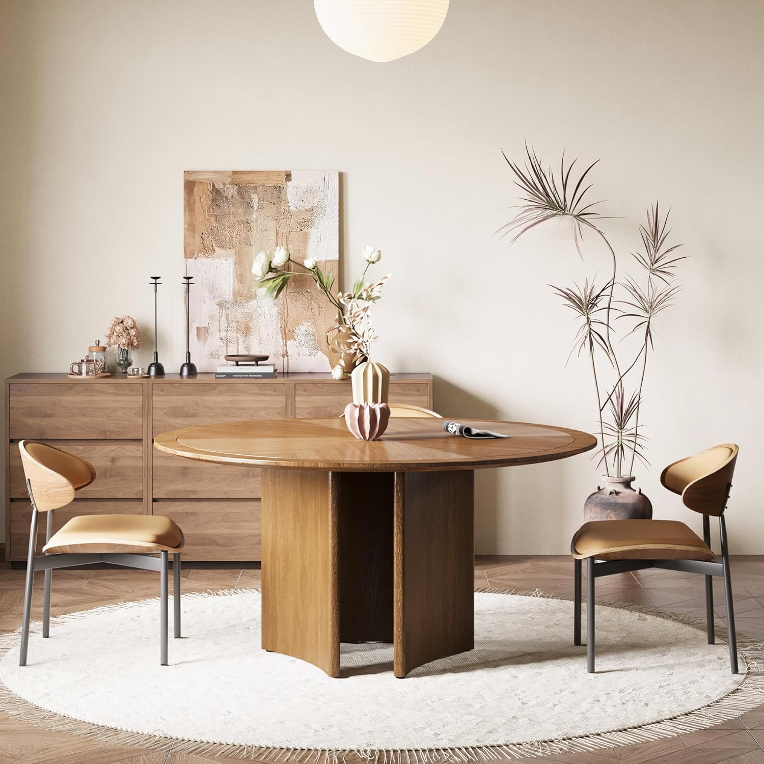Create a warm and modern dining space with this round walnut dining table, designed with a sleek pedestal base and a clean minimalist silhouette. The circular shape makes it perfect for gathering, conversation, and everyday meals, while the space-saving structure fits beautifully into apartments and compact dining areas.