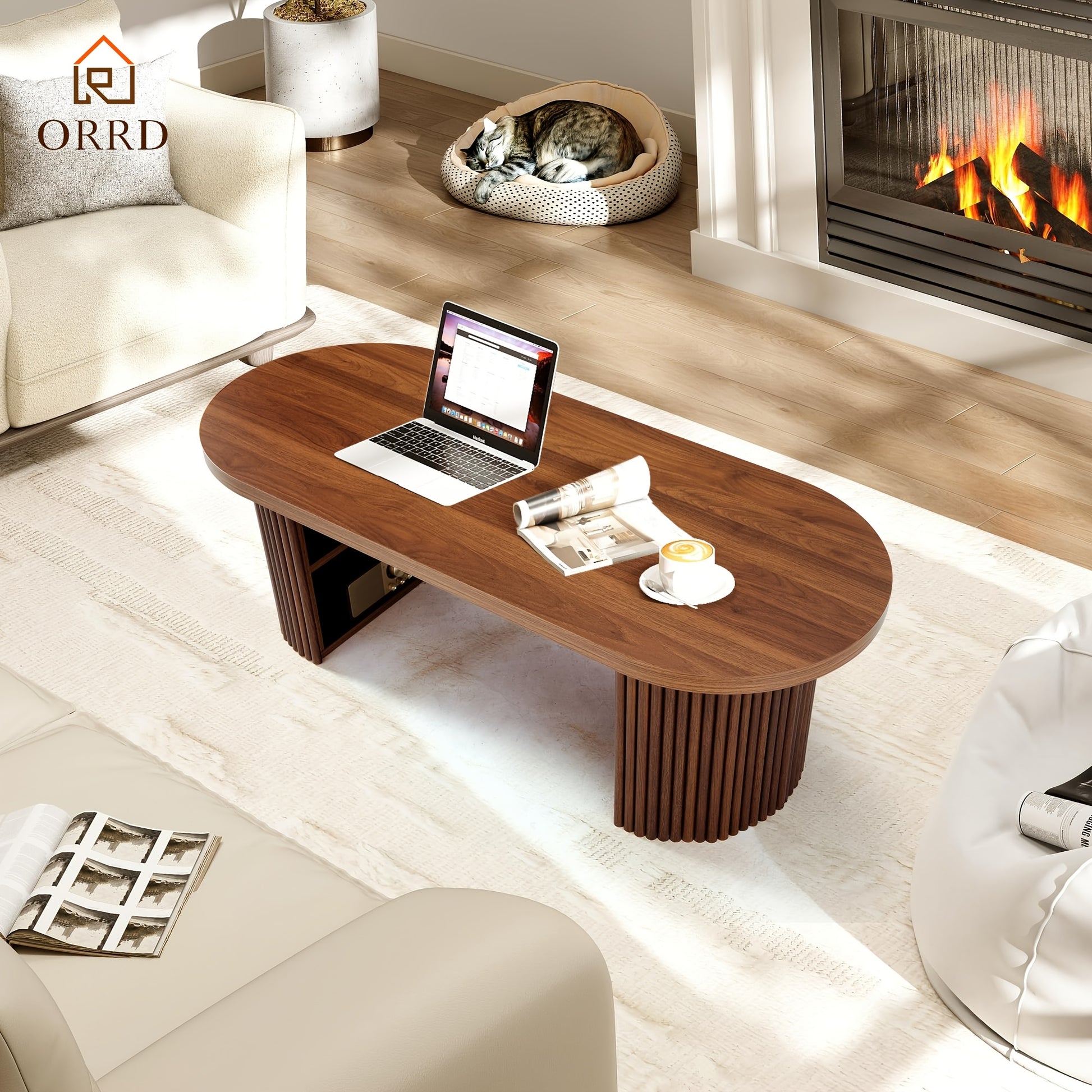 OOval Fluted Coffee Table with Storage – Farmhouse Mid-Century Center Table (47”)